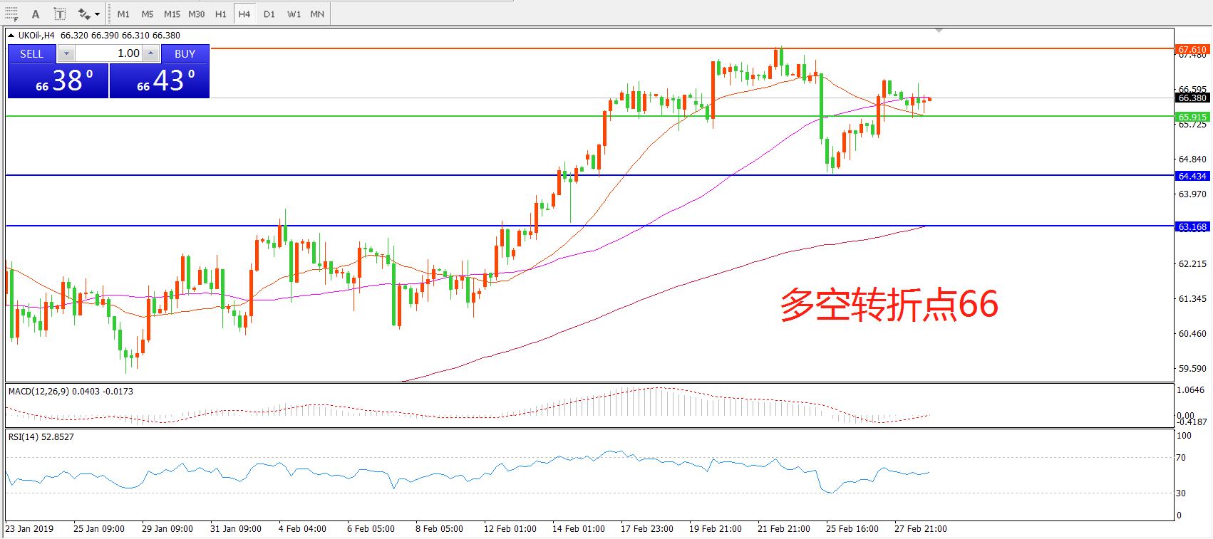 4小时图看,布油呈现窄幅震荡走势,以66美金一线为支撑,全天波幅较小,MACD红柱增加,RSI拐头向上,日内延续窄幅震荡后具有反弹可能。