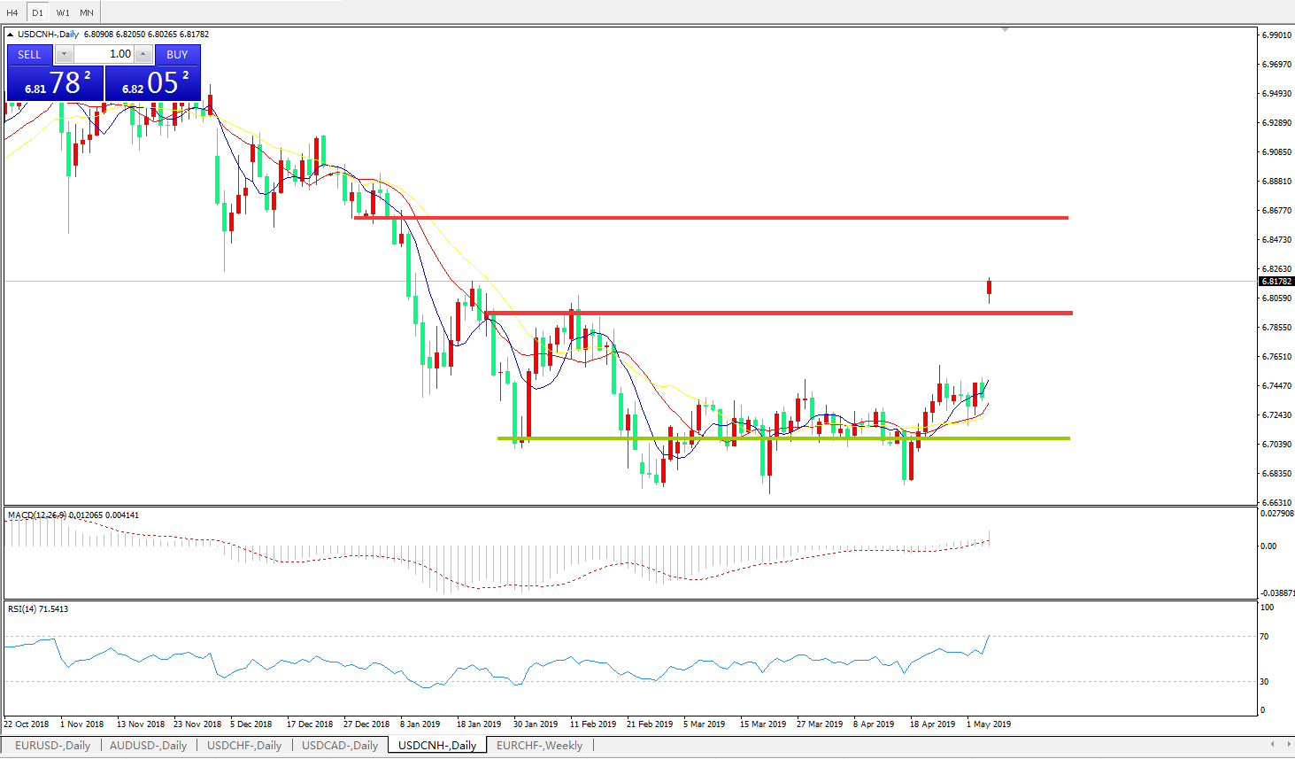 交易策略6.6990之上,看涨,目标价位为6.7845,然后为6.8200