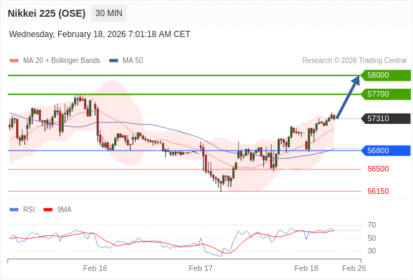 交易策略: 在 56800 之上,看涨,目标价位为 57700 ,然后为 58000 。