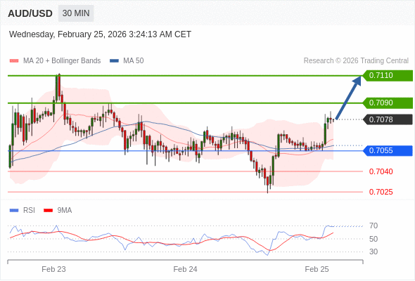 在 0.7055 之上,看涨,目标价位为 0.7090 ,然后为 0.7110 。