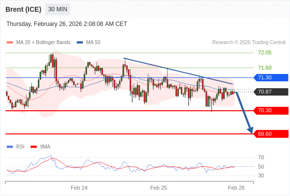 在 71.30 之下,看跌,目标价位为 70.30 ,然后为 69.60 。