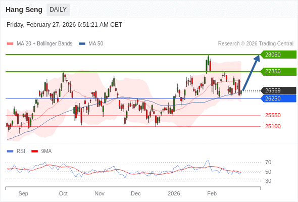 恒生指数 短线: 在26250之上,看涨。