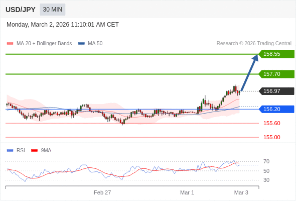 在 156.20 之上,看涨,目标价位为 157.70 ,然后为 158.55 。