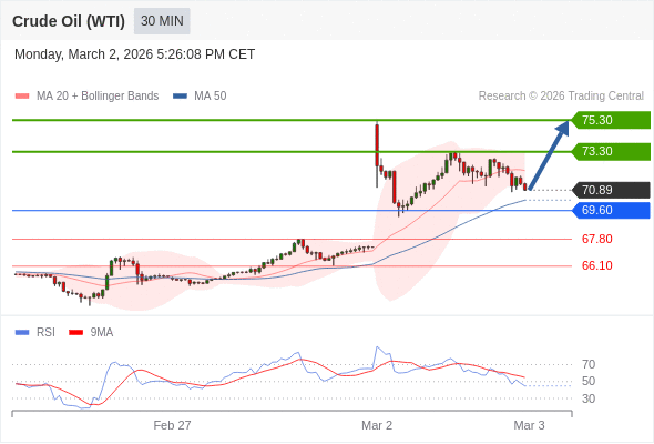 在 69.60 之上,看涨,目标价位为 73.30 ,然后为 75.30 。