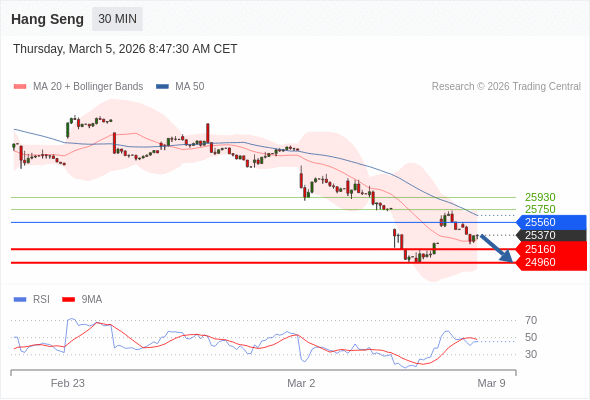恒生指数 当日内: 短期关键阻力位在25560。