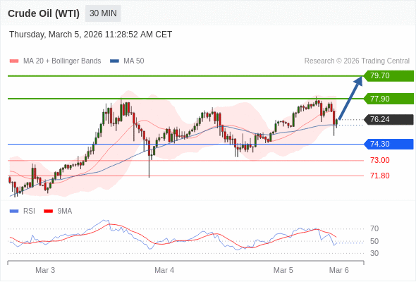 在 74.30 之上,看涨,目标价位为 77.90 ,然后为 79.70 。