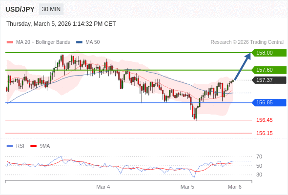 在 156.85 之上,看涨,目标价位为 157.60 ,然后为 158.00 。