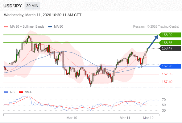 在 157.90 之上,看涨,目标价位为 158.65 ,然后为 158.90 。