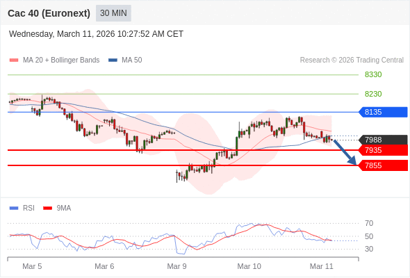 法国CAC指数期货 (Euronext) (H6) 当日内: 短期调整。