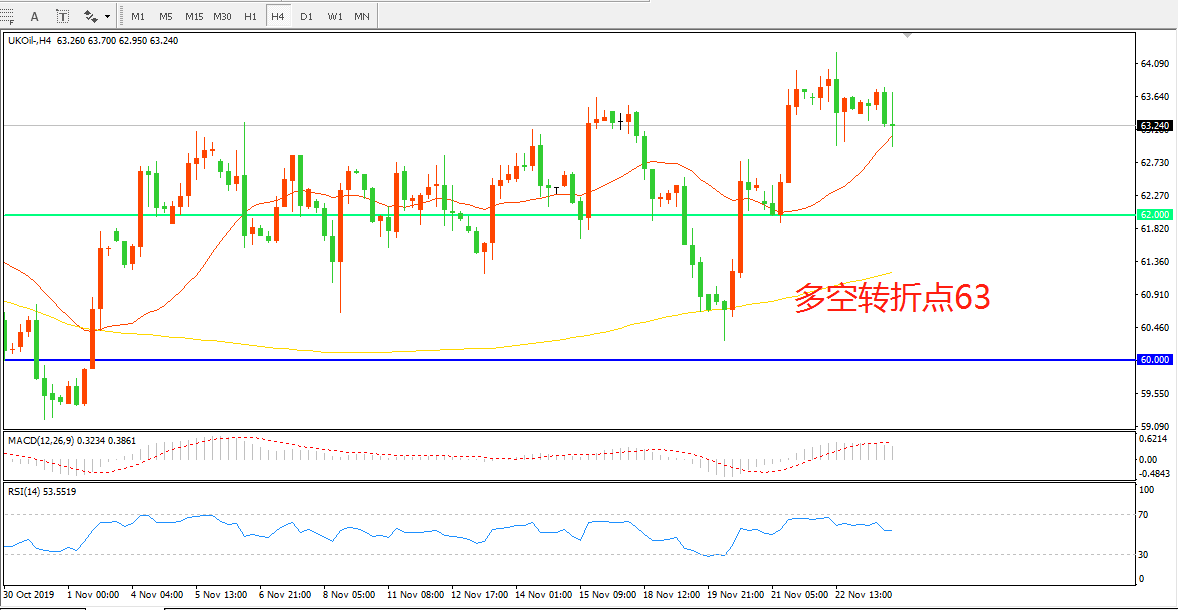 4小时图看,油价延续高位震荡,整体表现有所回暖,62美金成为下方明显支撑,均线系统走平,MACD红柱增加,RSI指标走平,短期回落有所可能,但整体走势依然强势。