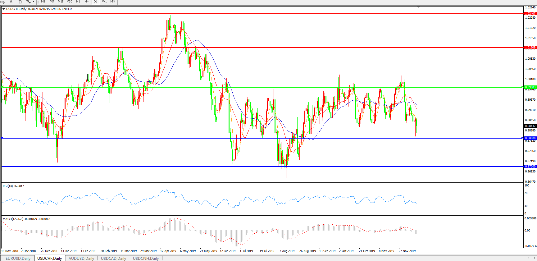 技术面简析:日线图均线呈有序空头排列,汇价昨日剧烈震荡持稳于0.98关口上方,MACD运行于0轴下方且量能0轴下持续放量,RSI震荡走低,预计汇价存进一步下行空间。