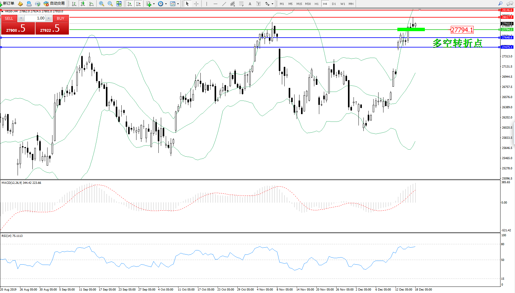 恒指HK50 ——4小时K线图显示: