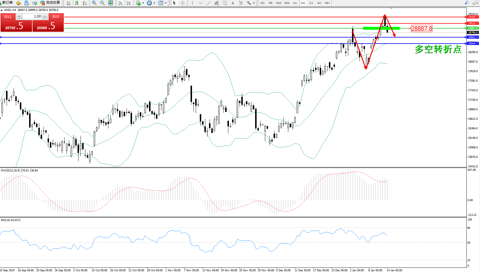 恒指HK50 ——4小时K线图显示: