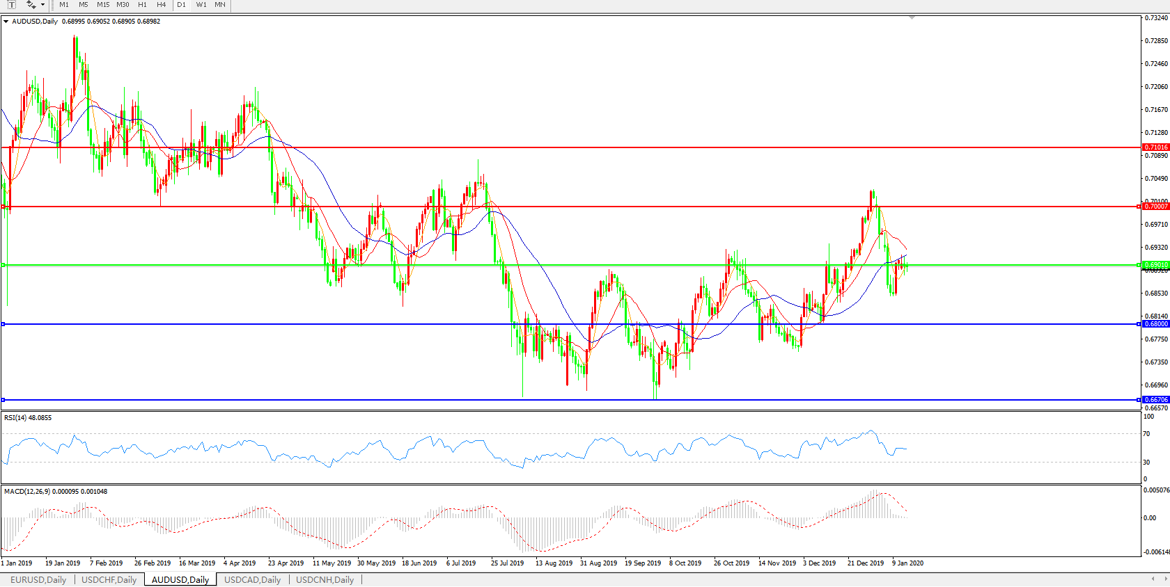 澳元兑美元在周二继续陷入盘整走势,基本无视了市场风险情绪进一步回暖所带来的提振。日内数据显示中国12月贸易进出口表现双双好于预期,而关键的中美一阶段贸易协定本周也将签署在即,这推动了日元与黄金等避险资产遭到抛售,但是澳元却并未如预期因此反弹;原因在于,澳大利亚国内的基本面负面消息压倒了来自外需领域的利好,市场更加担心该国持续失控的山林火灾对其经济基本面的冲击,以及对澳洲联储未来降息预期的提升,在澳洲联储2月降息概率已经过半的状况下,相关的负面情绪完全抵消了外部利多情绪提振; 这意味着澳元汇价仍无法彻底突破30日均线的阻力结束开年之际的单边跌势,而该国火情能否尽快得到控制则在很大程度上仍将左右澳元的后继走势,短线支撑在上周低位0.6850,失守后将打开更大范围的下行空间