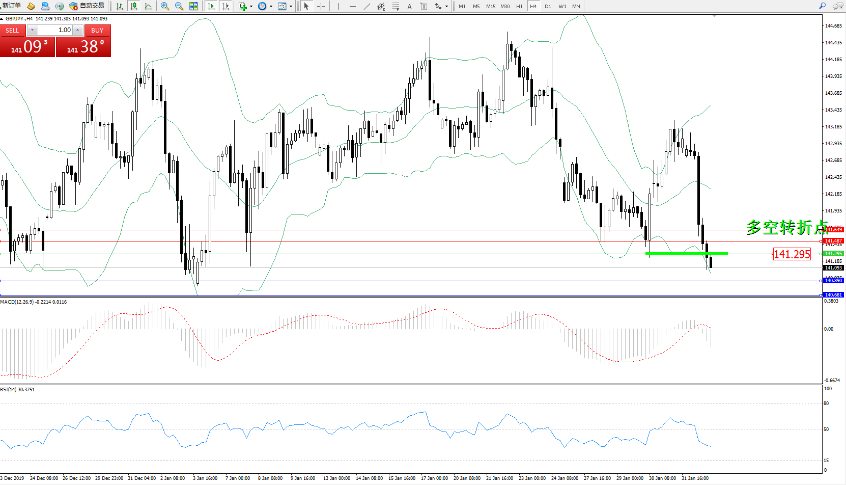 交易策略:141.295下方看跌,目标140.890、140.681