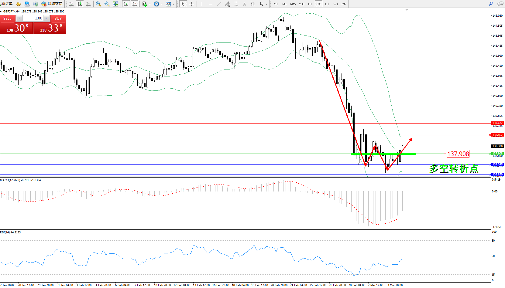 交易策略:137.908下方看跌,目标137.345、136.829