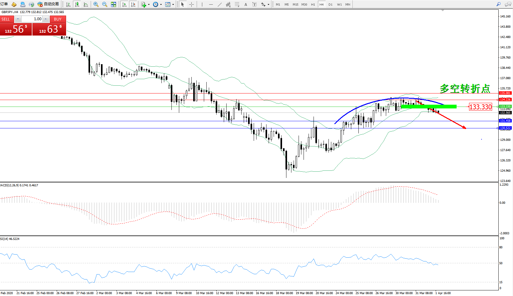交易策略:133.330下方看跌,目标131.458、130.522