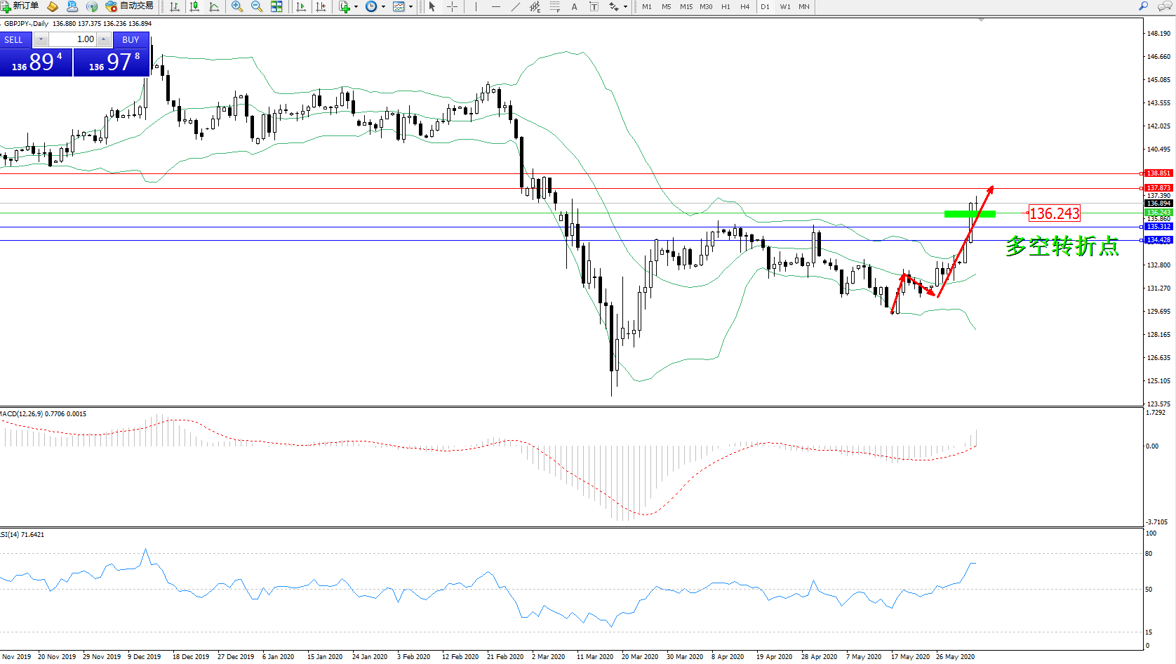 交易策略:136.243上方看涨,目标137.873、138.851