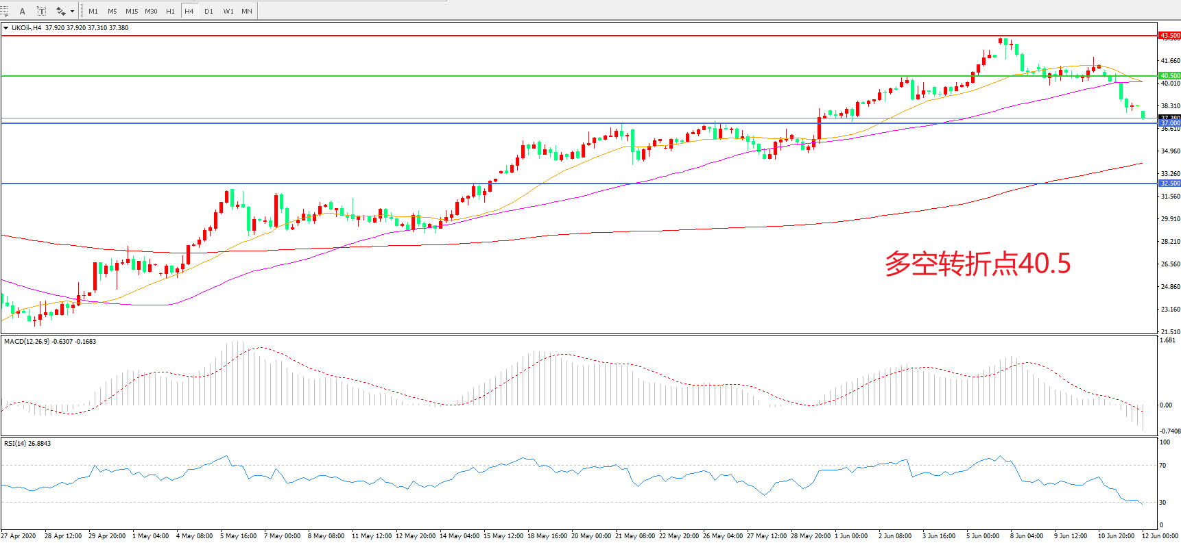 交易策略: 在40.50之下看跌,目标37.00 32.50