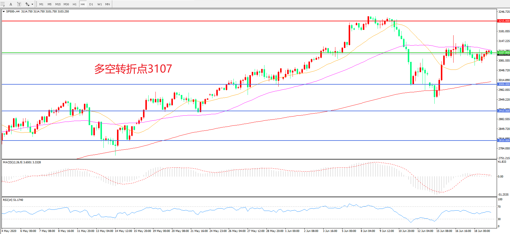 4小时图看,标普500延续高位震荡,振幅逐渐收窄,55周期均线成为中期阻力,MACD红柱缩短,RSI指标走平,日内延续震荡概率较大。