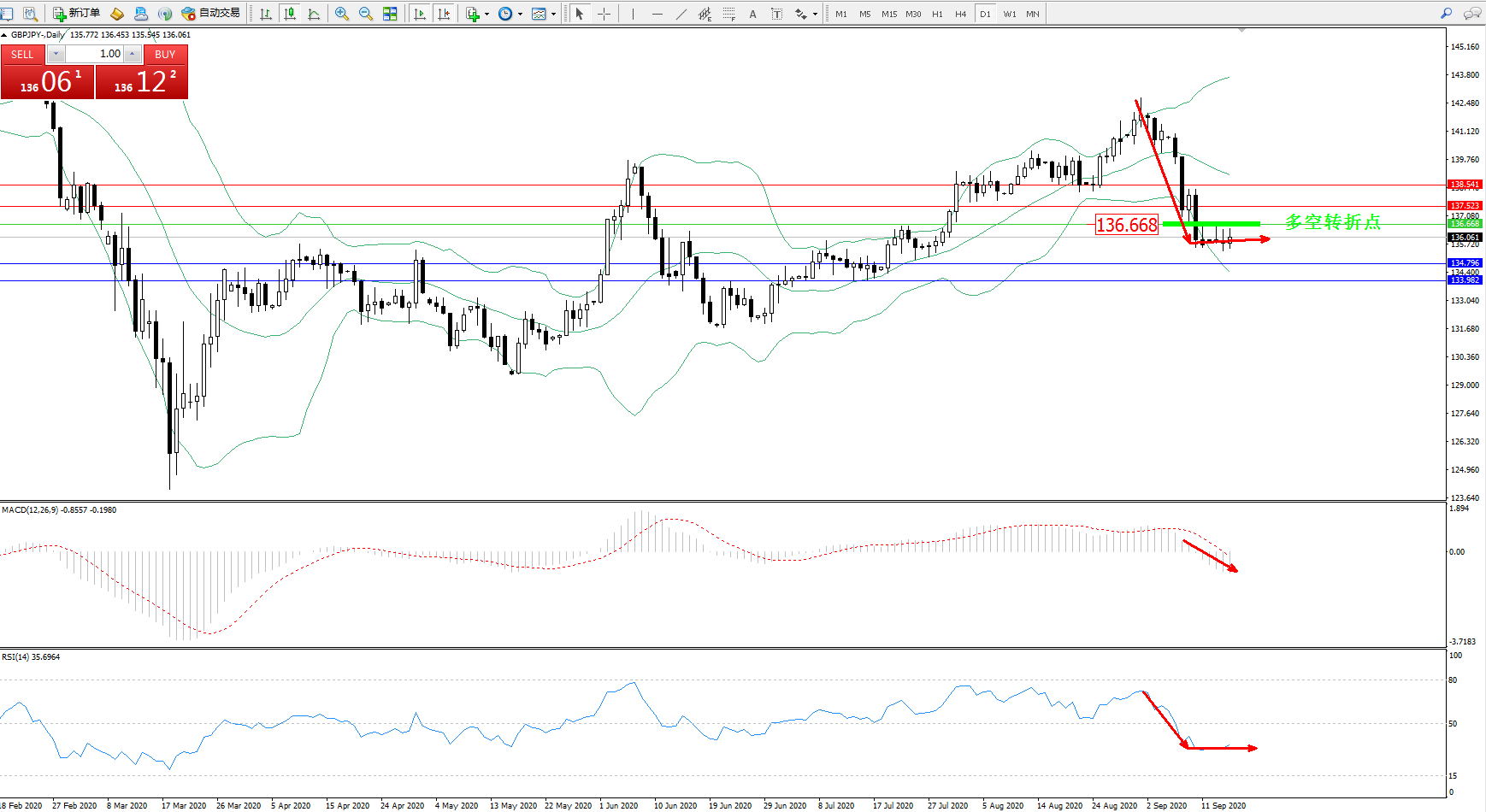 交易策略:136.668下方看跌,目标134.796、133.982