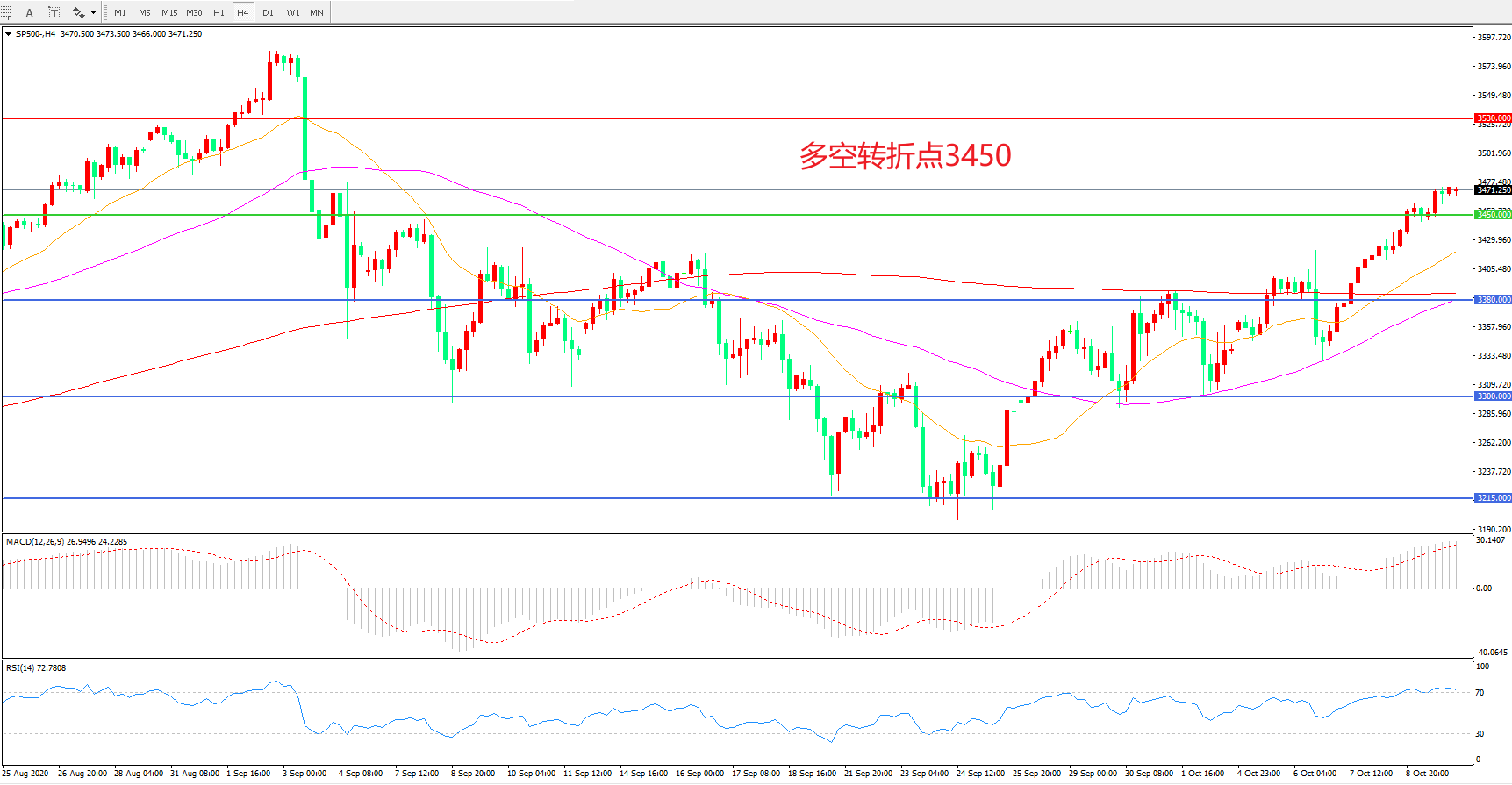 上周五(10月9日),美股投资者继续寄希望于政府采取财政刺激措施,美股延续上涨态势,标普500震荡上行后收报3473.50点。从当周美股表现看,标普500指数涨3.84%。周涨幅均为近3个月以来最高值。但周末众议院议长佩洛西在谈到特朗普政府的经济刺激方案时表示,特朗普是“向前一步倒退两步”,财政刺激计划的波折可能成为市场上行的巨大风险。