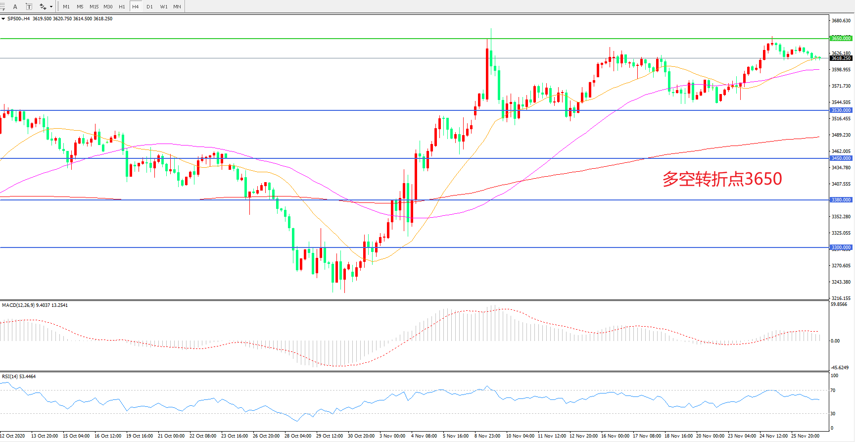 4小时图看,标普500延续窄幅震荡,整体波幅不大,3650成为短期多空分水岭,3600成为短期支撑,短期均线拐头向上,MACD红柱增加,RSI指标向上,日内延续上行概率较大。