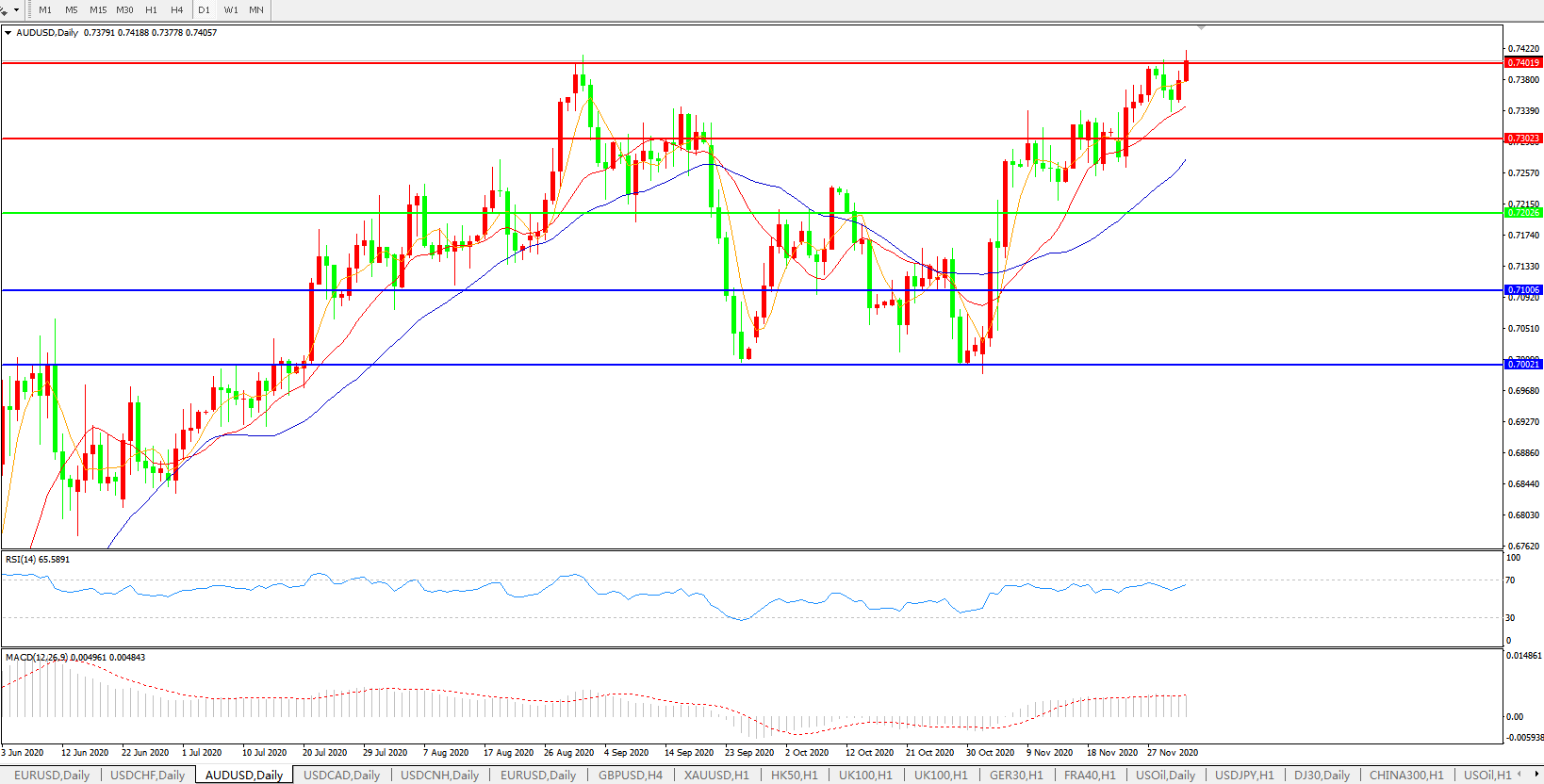 澳元兑美元在周三日内陷入横盘震荡走势,数度试图重新上攻0.74关口而无果,虽然日内稍早澳洲GDP数据表现整体令人满意,但是分项数据却显示在就业等领域隐忧犹存,这令汇价上行空间受到限制。与此同时,澳洲当前面临的贸易环境困境也令澳元汇价无法继续保持之前的强势;如此背景下,在本周一见高回落后,澳元汇价再度上行攻击前期高位0.7414的尝试依旧无功而返,这也使得0.74关口及上方的阻力变得益发沉重。而日线RSI指标也指向汇价上行动能已趋向于衰竭,后市更可能面临进一步的回调,下方支撑下看11月19日的低点0.7255,以及55日均线切入位0.7198;反之,一旦后市有更多风险利多消息带动商品系货币走强,推动澳元升破年内前高,则之前澳元汇价自0.8136跌至0.5510这波趋势的78.6%回撤位,约在0.7574处,将成为汇价的下一步征服目标澳元兑美元在澳洲贸易账数据大幅向好之后不涨反跌,回撤至0.74关口