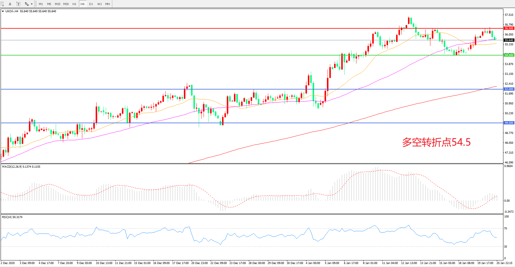 交易策略:  在54.50之上看涨,目标56.50    60.00