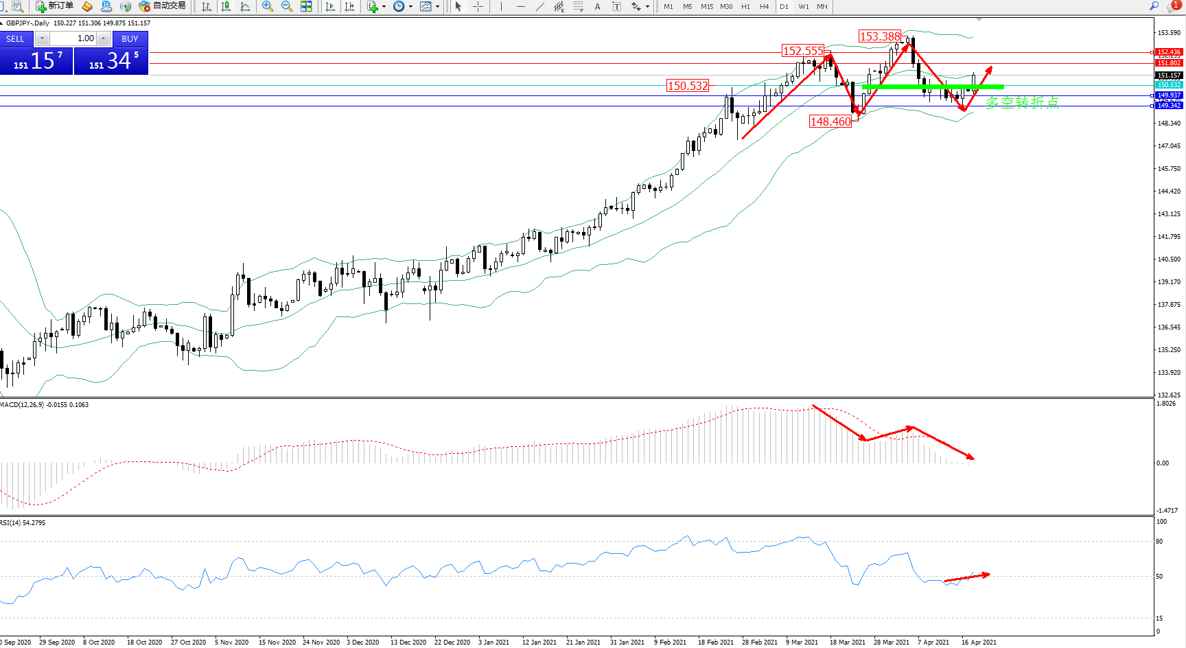 交易策略:150.532上方看涨,目标151.802、152.436