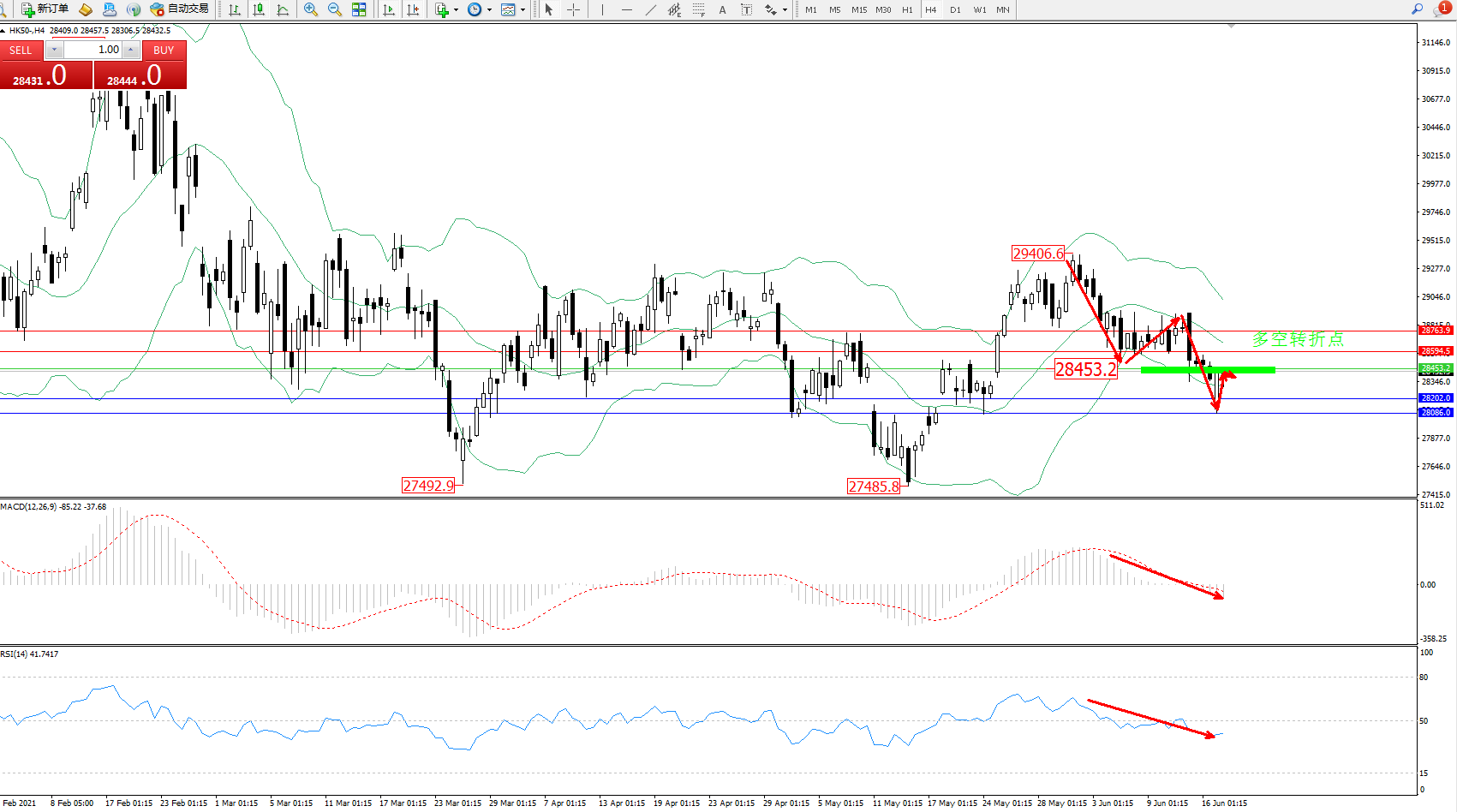 恒指HK50 ——4小时K线图显示: