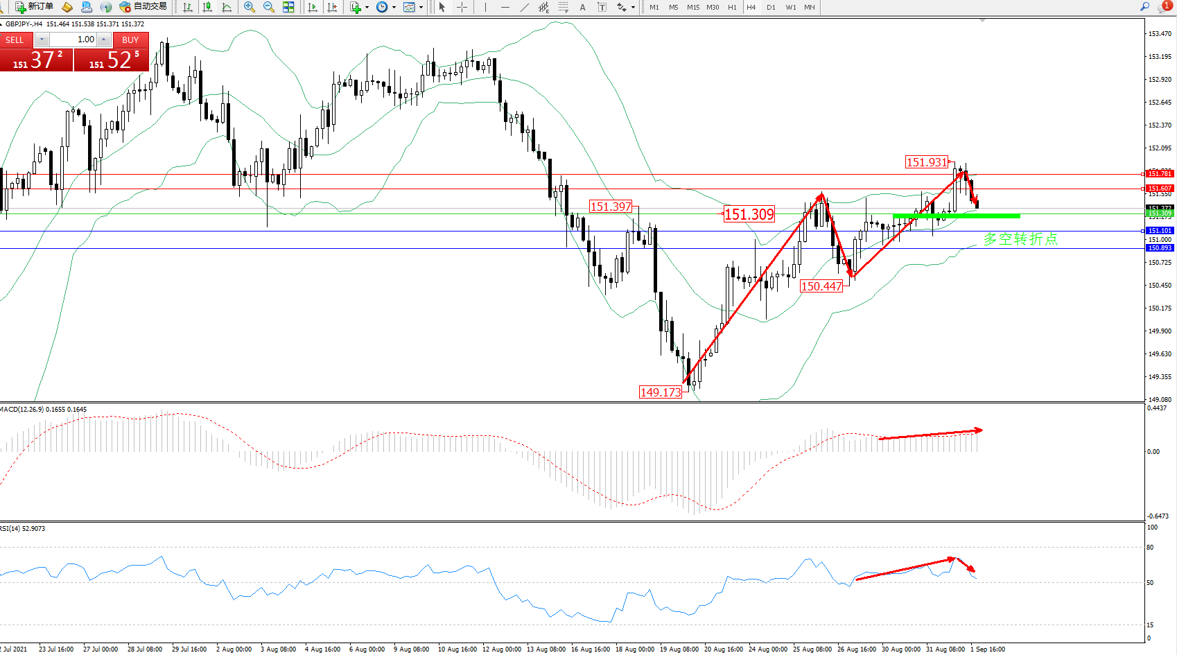 交易策略:151.309上方看涨,目标151.607、151.781