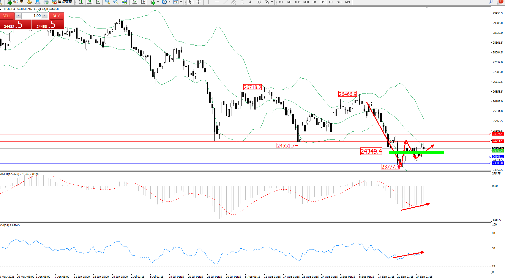 恒指HK50 ——4小时K线图显示: