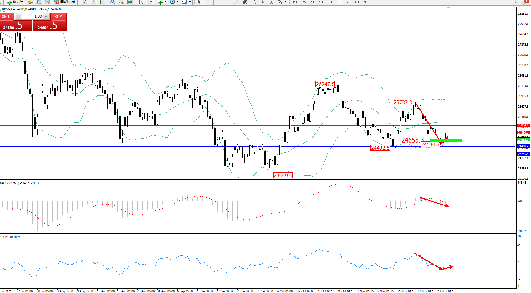 恒指HK50 ——4小时K线图显示: