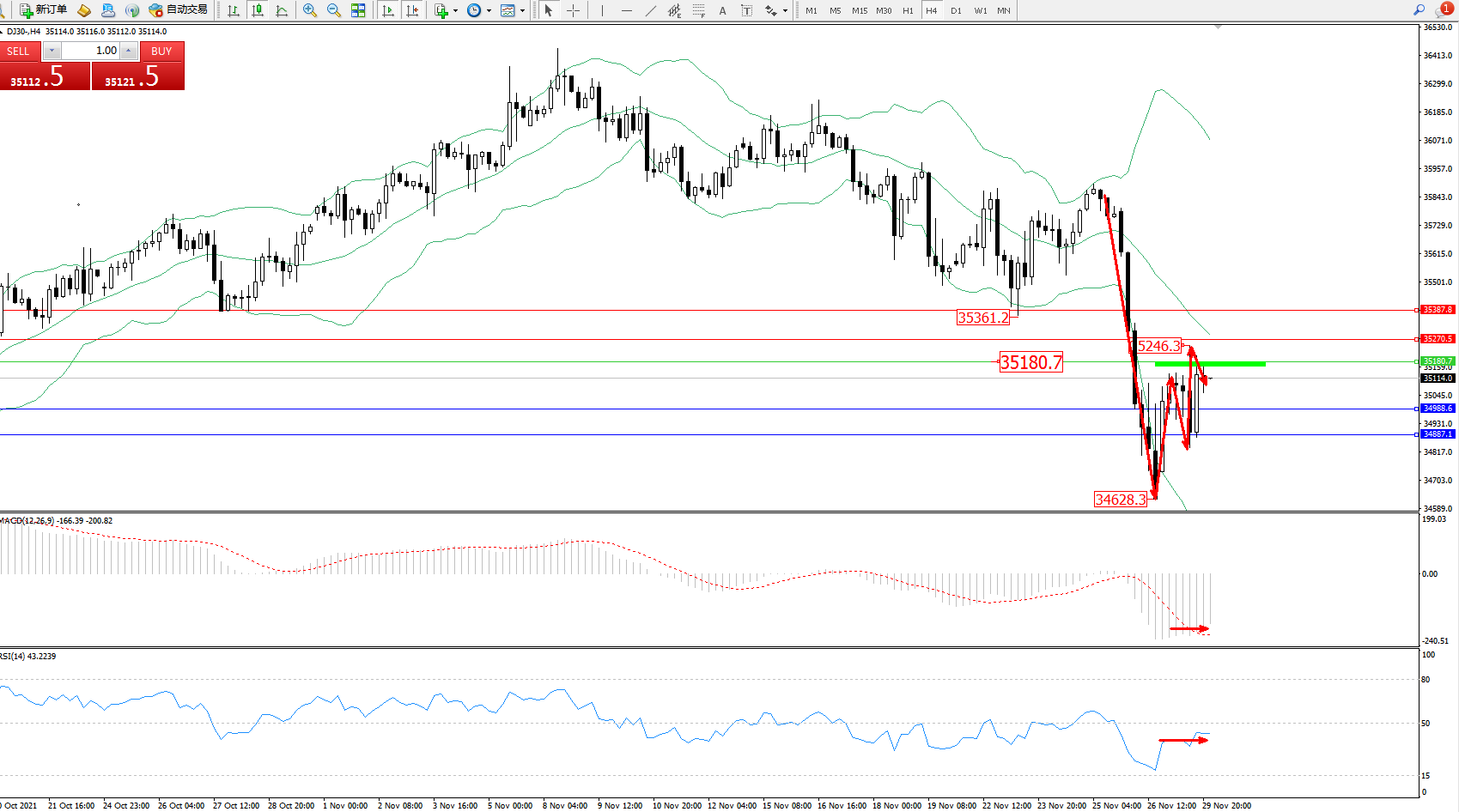 道琼斯指数DJ30——4小时K线图显示: