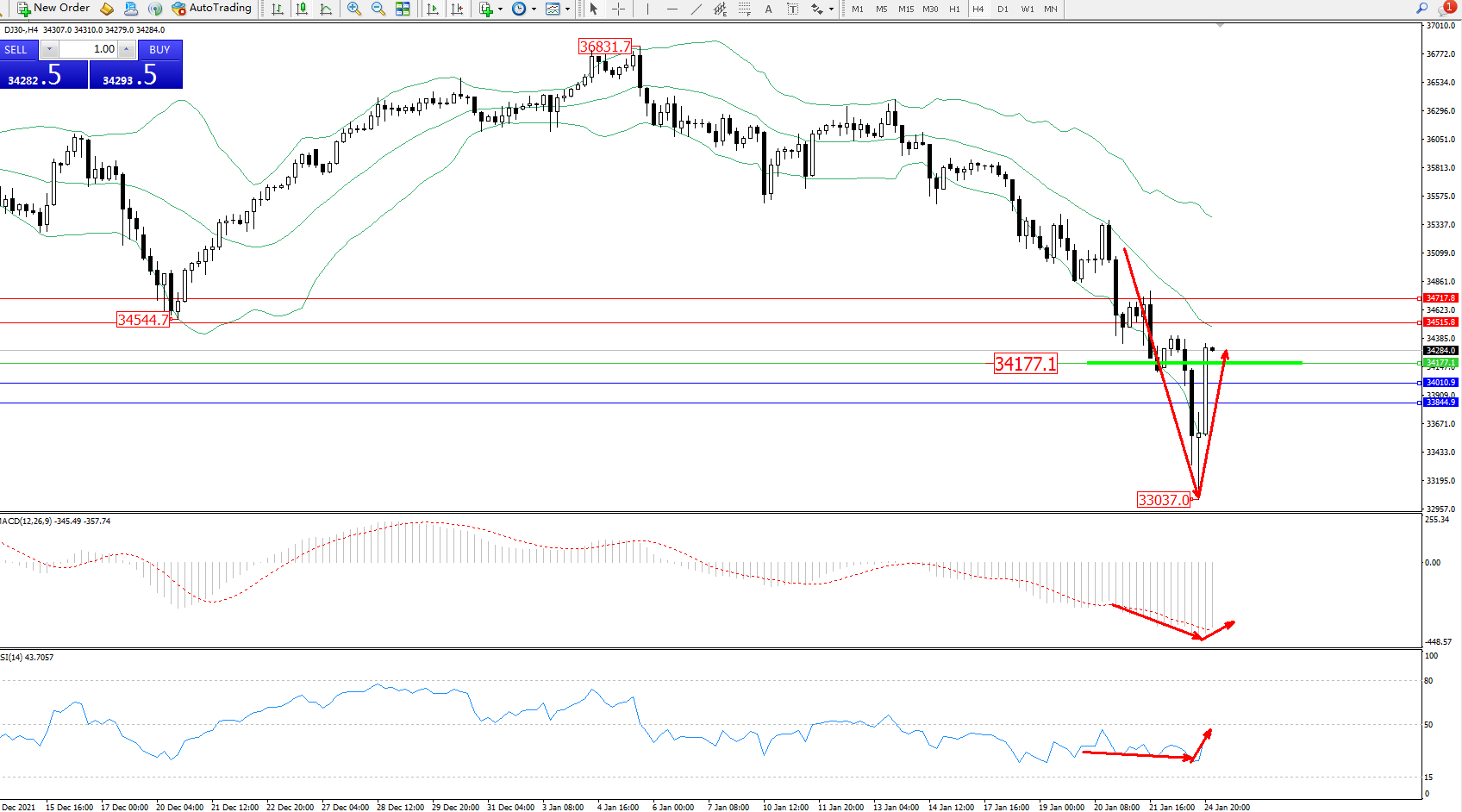 道琼斯指数DJ30——4小时K线图显示: