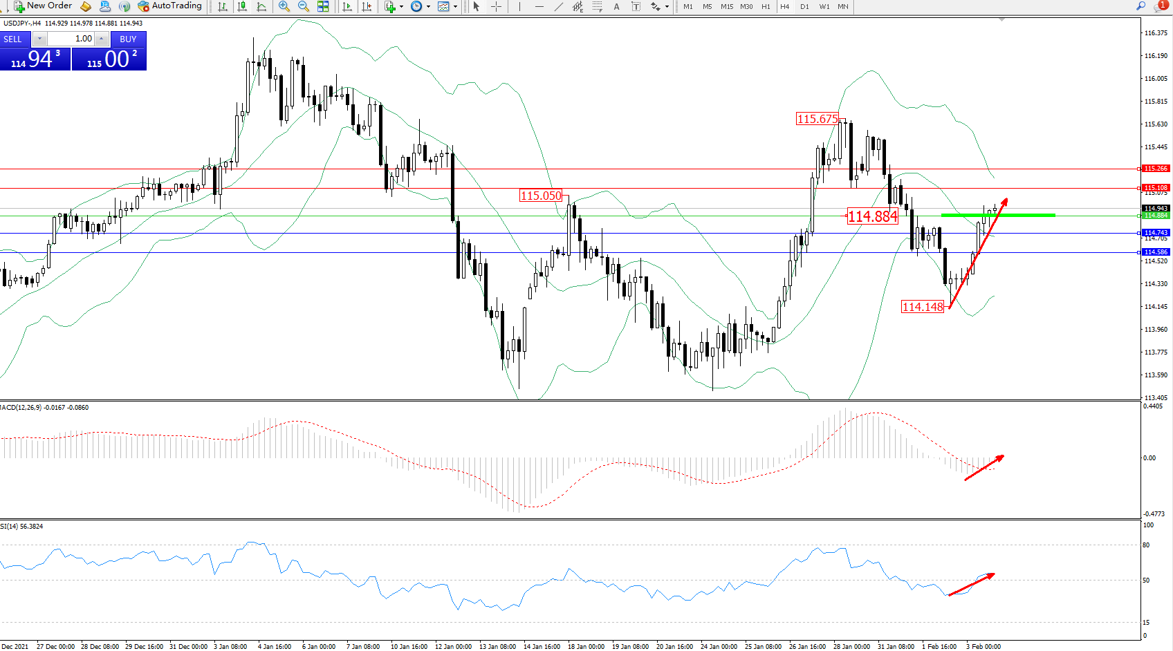 交易策略:114.884上方看涨,目标115.108、115.266