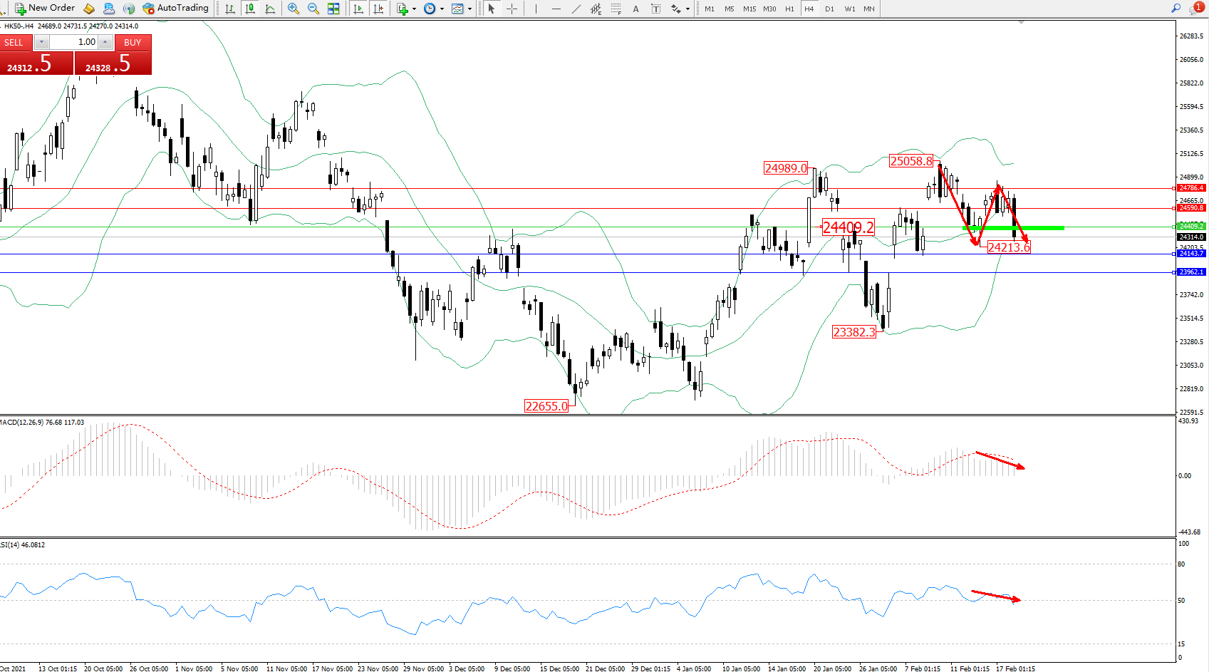 恒指HK50 ——4小时K线图显示: