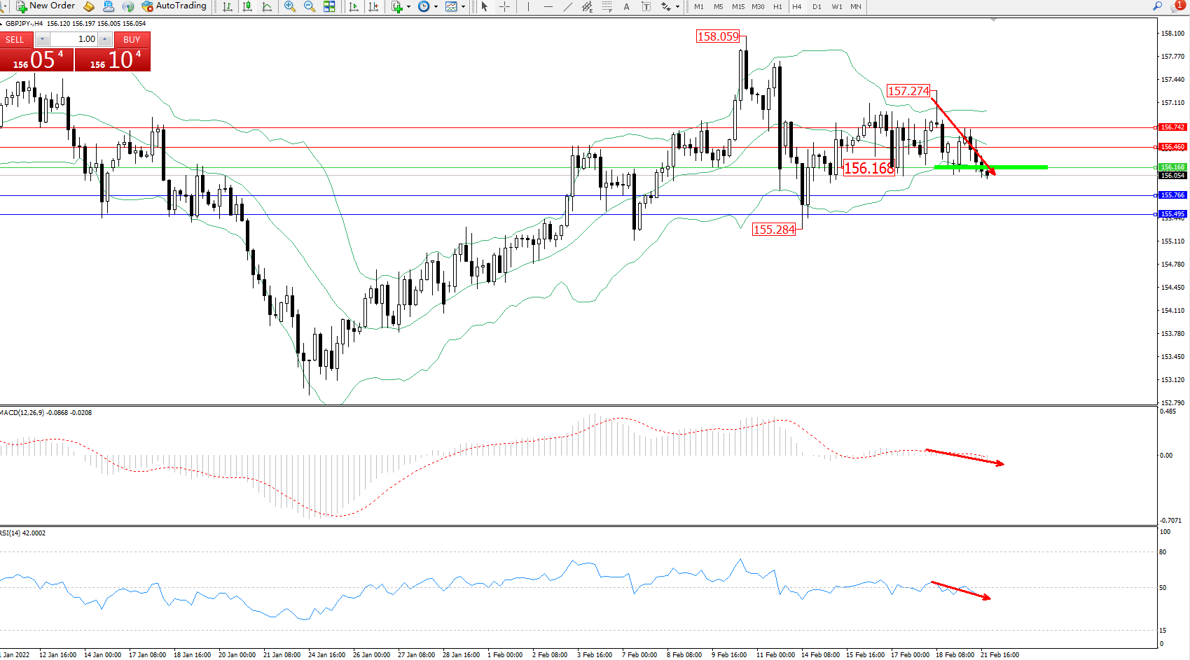 交易策略:156.168下方看跌,目标155.766、155.496
