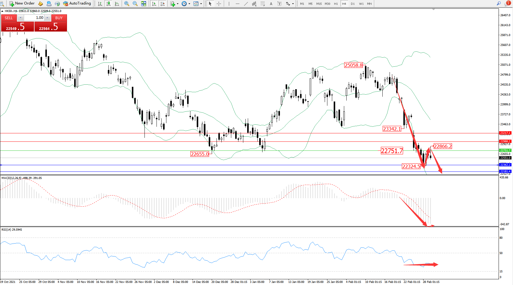 恒指HK50 ——4小时K线图显示: