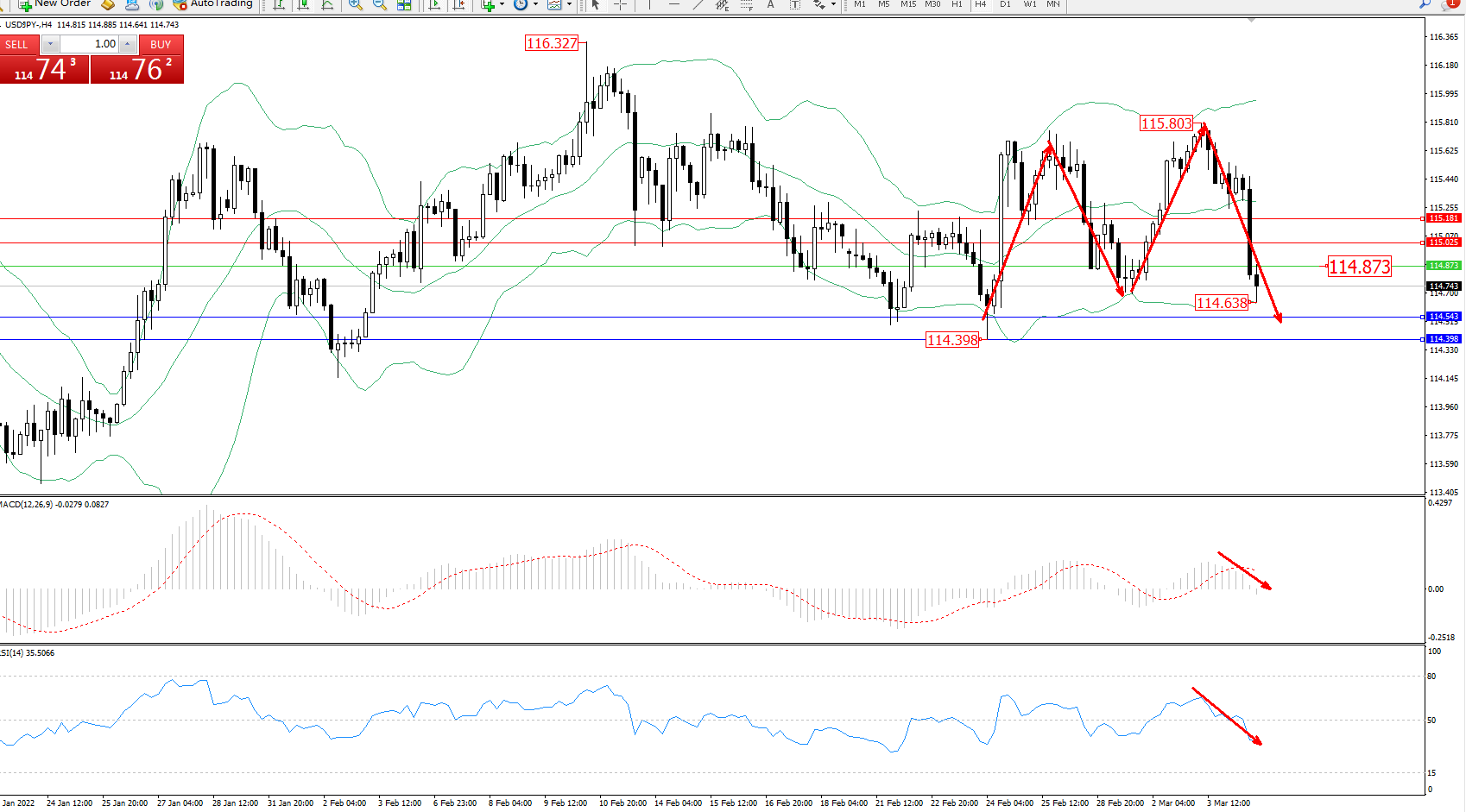 交易策略:114.873下方看跌,目标114.543、114.398