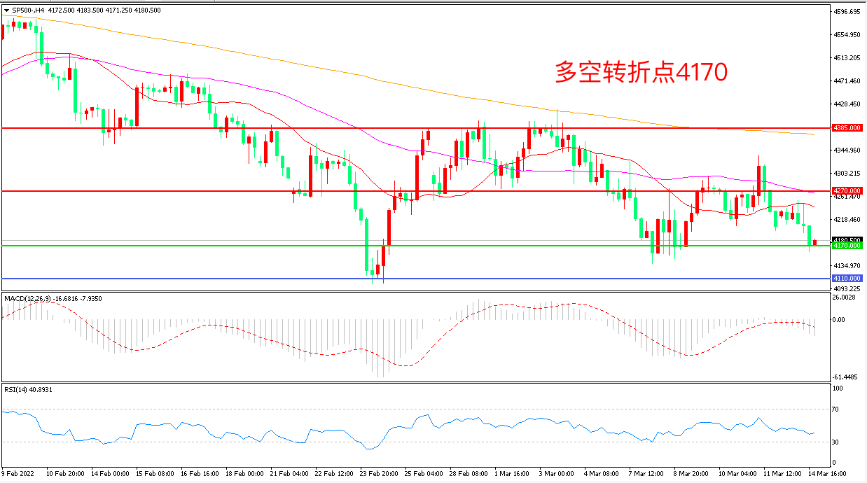 周一(3月14日),投资者期待俄乌谈判进展,静候美联储周三会议结束后公布新政策决议,美股再度上演盘中转跌,标普500大幅下挫,收报4180.50点。原油大跌拖累的能源板块领跌,蓝筹科技股所在的板块跌幅居前,目前美联储加息以对抗通胀几乎成定局,流动性收紧的冲击下,美股继续承压概率较大。