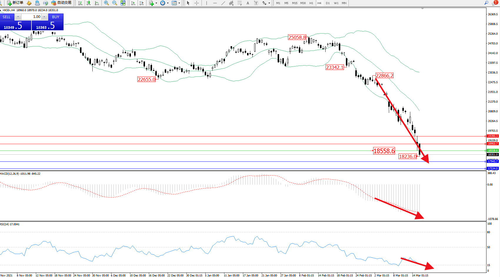 恒指HK50 ——4小时K线图显示: