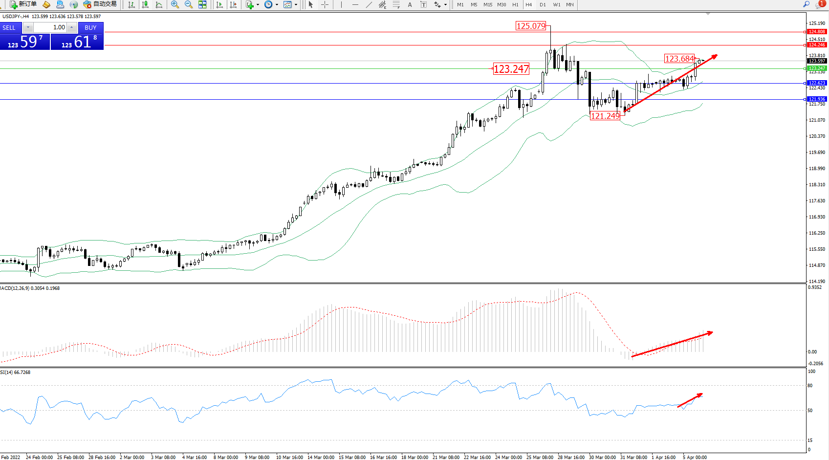 交易策略:123.247上方看涨,目标124.246、124.808