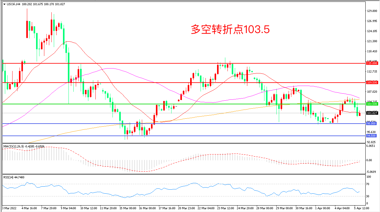 周二(4月5日),俄乌局势风云突变,泽连斯基改口态称准备好加入北约,可能不会见普京,但上周的暴跌依然让多头心有余悸,美国WTI原油小幅回落,收报101.00美元/桶。考虑到目前原油市场供应层面因地缘因素仍有很高不确定性,且原油库存处于7年多来低位,所以油价暂时不具备持续大跌条件,真正改善因地缘冲突导致供应紧张的局面还是需要地缘或供应端有积极的信号出现才行。