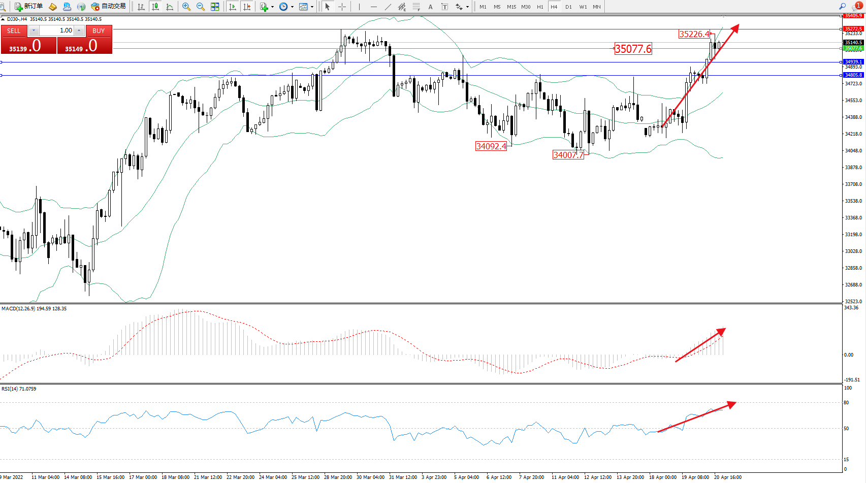 技术点评:多头动力延续布林带指标上轨附近持续震荡上扬,高位抵达35226附近节点后窄幅整理,多头动力有继续上扬态势,布林带指标呈张口走势持续中,MACD指标处于多头区域维持震荡向上拉升,RSI指标处于多头区域维持整理不断上移中;