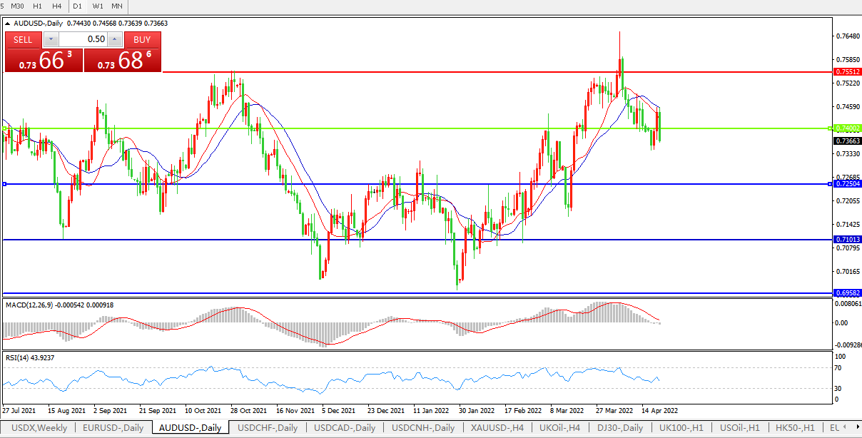 交易策略:0.7400下方看跌,目标0.7250、0.7100