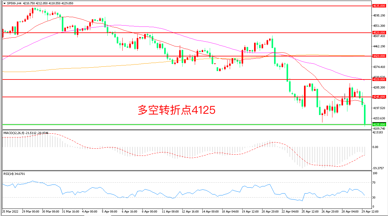 上周五(4月29日),美国3月PCE个人消费支出物价指数同比涨6.6%,刷新1982年来最高,市场持续担心美联储收紧政策无法实现“经济软着陆”,标普500长阴下破,收报4129.05点。4月以来,标普500累计跌幅已达8.8%,创下2020年3月以来的最大单月跌幅,鉴于人气和头寸的低迷,虽然市场有可能出现反弹,但反弹幅度不会很大。