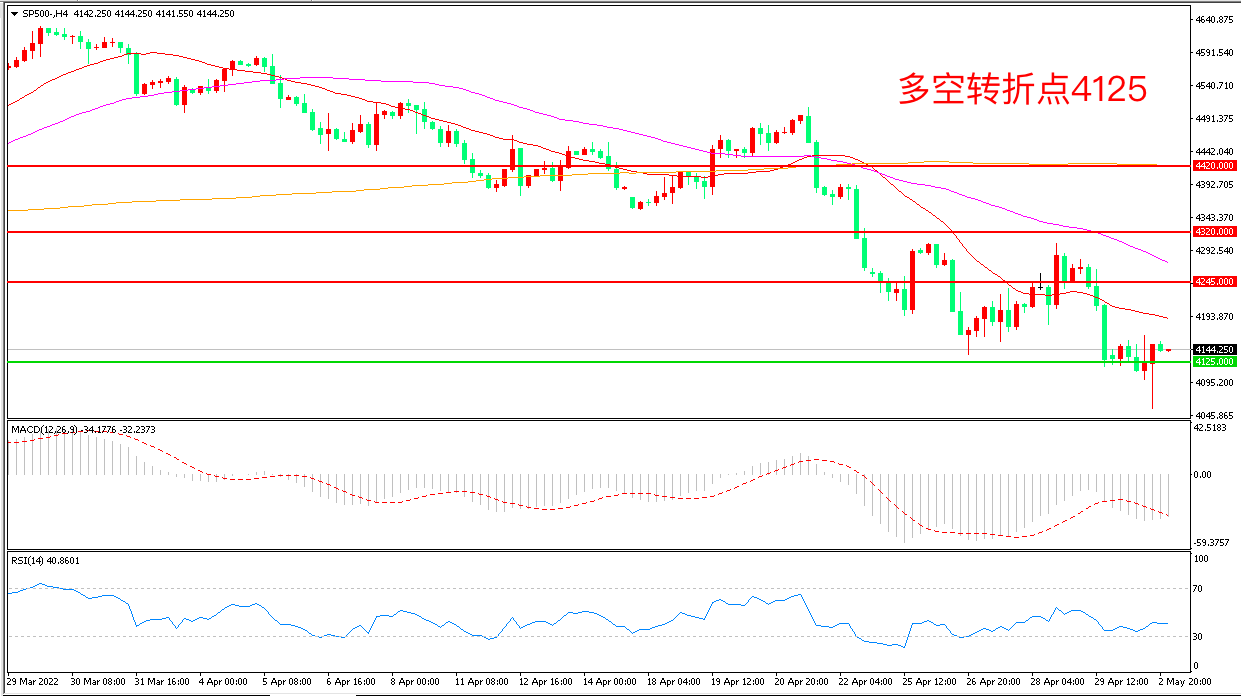 周一(5月2日),美国ISM制造业指数意外不升反降,给美联储激进行动又添砝码,议息会议大幅加息的预期重挫美股,标普500盘中重挫后尾盘拉升,收报4142.65点。投资者正等待美联储的议息会议结果,以获得有关货币紧缩步伐的更多信号,市场预计美联储将再次加息,以应对数十年来最高的通胀,宽裕流动性缩紧成为美股最大的”敌人”。