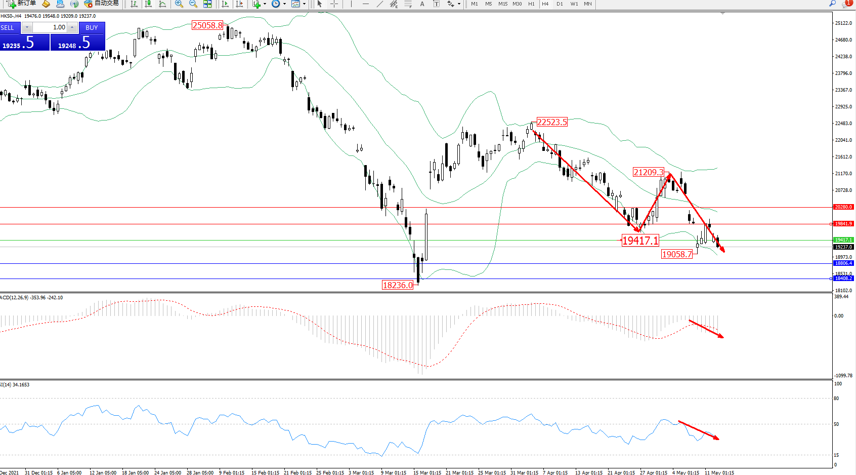 恒指HK50 ——4小时K线图显示: